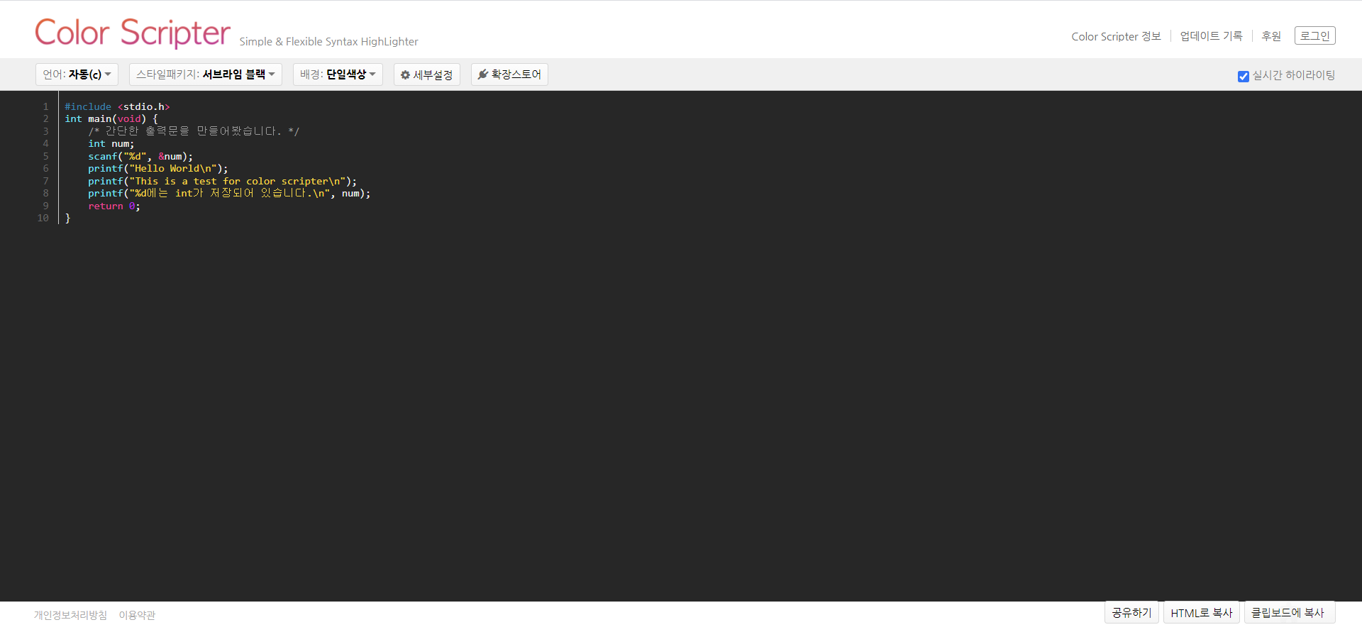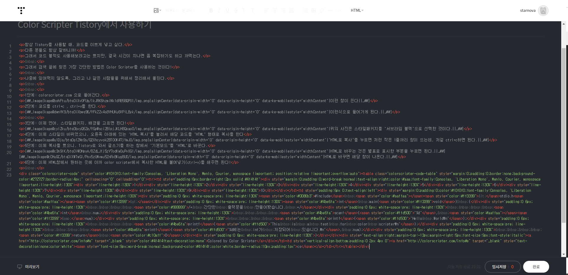 6단계: 이제 HTML창에서 원하는 곳에 아까 color scripter에서 복사한 HTML을 붙여넣기(ctrl+v)를 해주면 된다!