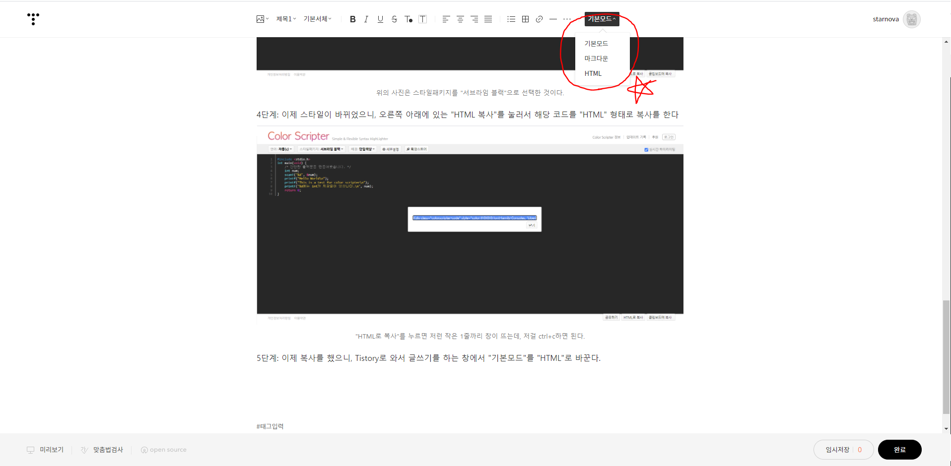 5단계: 이제 복사를 했으니, Tistory로 와서 글쓰기를 하는 창에서 "기본모드"를 "HTML"로 바꾼다.