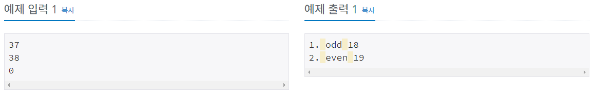 각 테스트 케이스에 대해서, 케이스 번호를 출력하고 n1이 짝수라면 'even', 홀수라면 'odd'를 출력하고, n4를 출력한다.