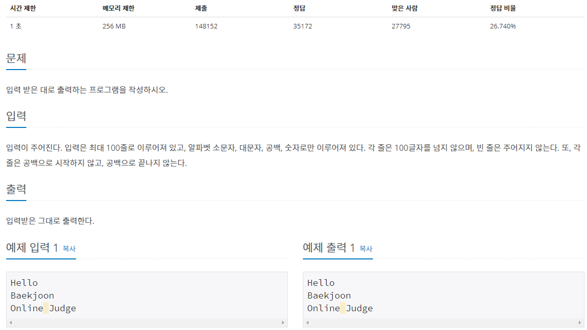 입력이 주어진다. 입력은 최대 100줄로 이루어져 있고, 알파벳 소문자, 대문자, 공백, 숫자로만 이루어져 있다. 각 줄은 100글자를 넘지 않으며, 빈 줄은 주어지지 않는다. 또, 각 줄은 공백으로 시
